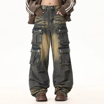 Pantalones vaqueros holgados de diseñador personalizados para hombre, Vaqueros vintage lavados hasta el suelo, pantalones vaqueros desgastados de pierna ancha con múltiples bolsillos, pantalones Cargo para hombre